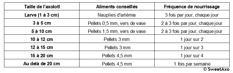 IL EST ÉGALEMENT IMPORTANT DE SAVOIR QUE, SELON SON ÂGE OU SA TAILLE, L’ALIMENTATION ET LA FRÉQUENCE DE NOURRISSAGE DE VOTRE AXOLOTL NE SERONT PAS LES MÊMES.