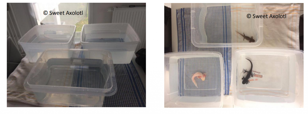 - 2 Caisses plastiques de 20 litres environ par axolotl, du type caisse de rangement de chez Action, Ikea etc… En effet, votre axolotl devra respecter une quarantaine à son arrivée (cliquez ici pour en connaitre le procotole) Ces caisses vous seront utiles tout au long de la vie de vos axolotls.