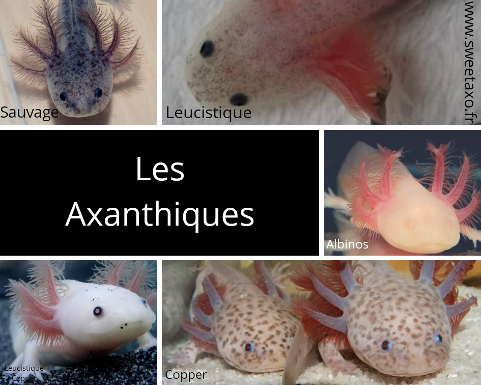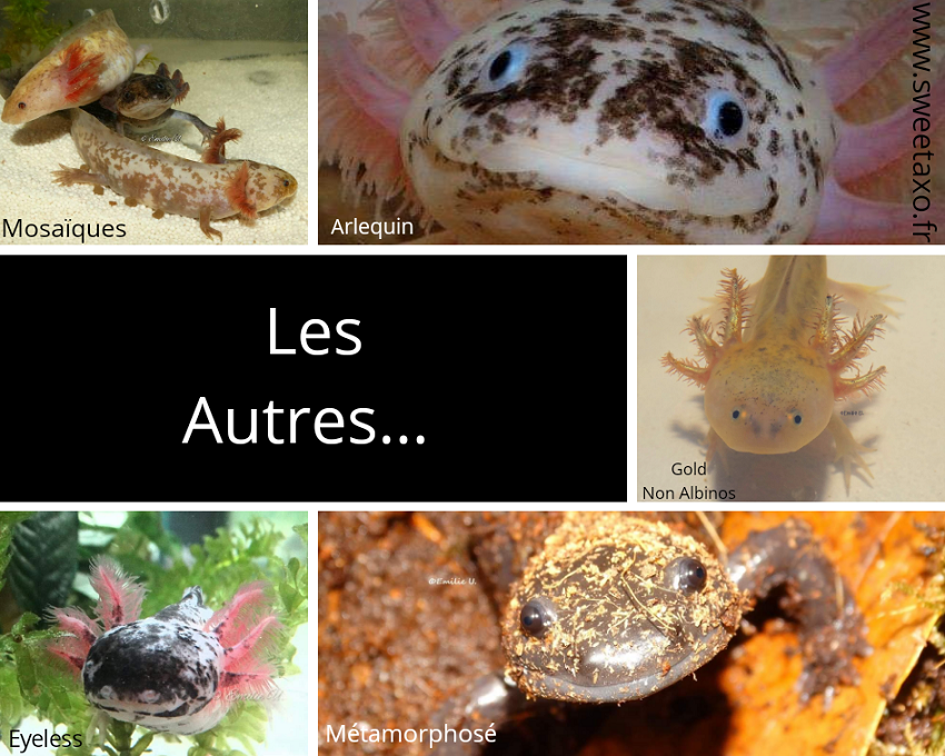 Celles ci sont les plus simples à reconnaitre. Toutes, sans exception, portent un cercle doré dans l’oeil. Ce sont celles qui peuvent présenter la totalité des pigments qui peuvent être sur le corps d’un axolotl.