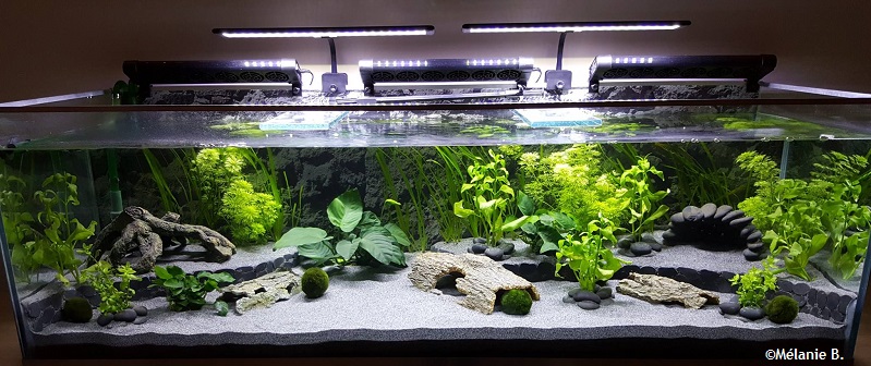 Nous vous conseillons d’installer une grande majorité de plantes à croissance rapide comme les elodees par exemple qui vont faire concurrence aux algues et vous offrirons des boutures à l’infini! Nous vous conseillons également les anubias, qui existent de tailles et de formes différentes. Ce sont des plantes robustes que vous garderez des années!
